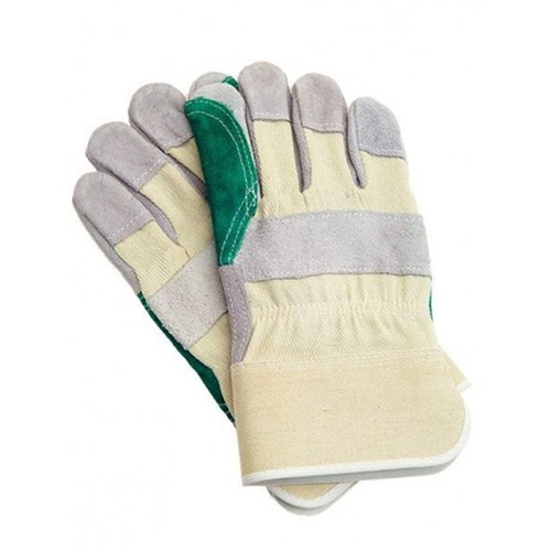 Rękawice ochronne wzmacniane skórą bydlęcą licową w jasnych kolorach , część chwytna , palec wskazujący oraz kciuk dodatkowo wzmacniane skórą bydlęcą w kolorze zielonym drelich w kolorze białym , mankiet usztywniany kauczukowy , od wewnątrz podszewka co podnosi komfort użytkowania , rękawica bardzo mocna i wytrzymała .