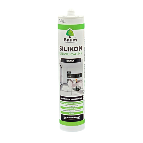 BAUM . Silikon Uniwersalny to uniwersalny, jednoskładnikowy, trwale elastyczny silikonowy kit uszczelniający z octowym systemem utwardzania, przeznaczony do uszczelnień budowlanych.