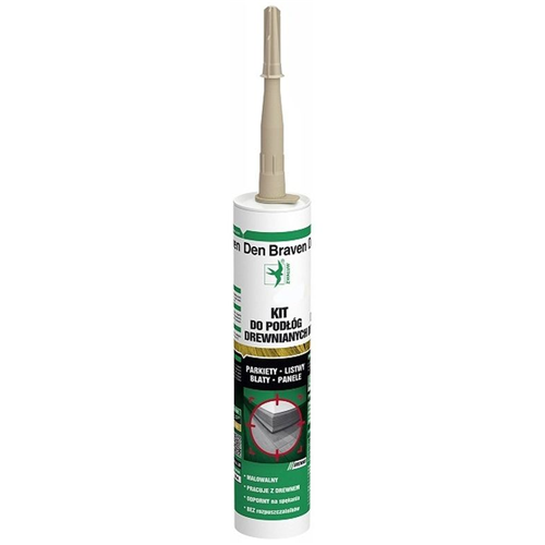 Den Braven Kit Do Podłóg Drewnianych to wysoce plastyczno-elastyczny kit uszczelniający na bazie wodnej dyspersji akrylowej, do wypełniania szczelin w parkietach i podłogach drewnianych podobnego typu
