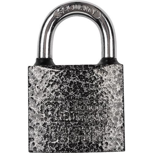 Wykonana ze stali czarna kłódka zatrzaskowa z uszczelkami.